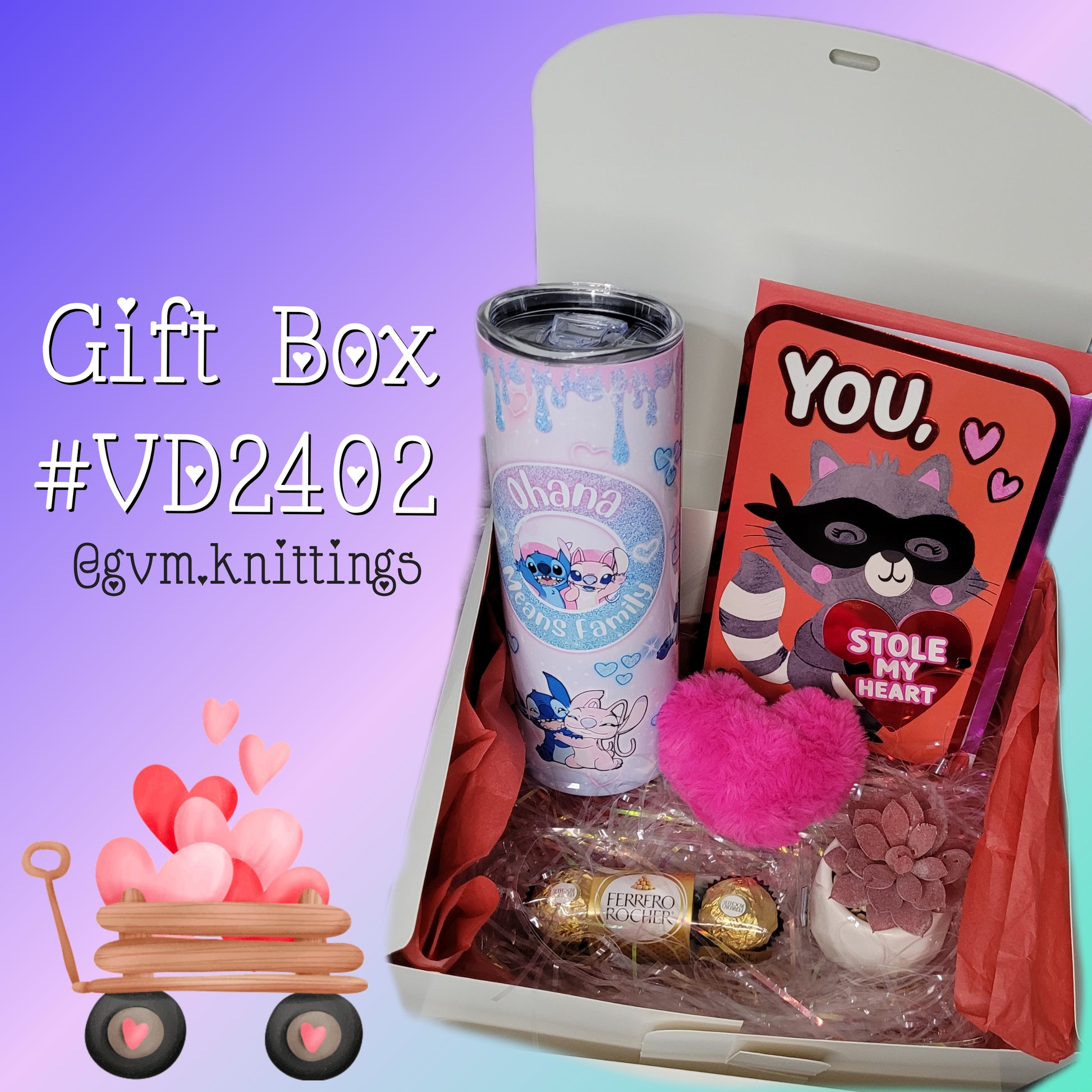 "Love is brewing with our Stitch Tumbler, complete with a heart key change, delicious chocolate, and a sentimental Valentine card. Plus, our artificial succulent adds a touch of everlasting love. All packaged in a charming gift box for the perfect Valentine's Day gift!"